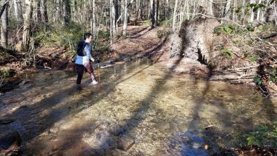 We got super lucky with the weather this year. All-day rain on Friday gave way to sunshine and highs of 55 degrees on Saturday. Runners weren’t in the clear, though. Those new to the Massanutten Mountain trails found landmines in the leaf-covered rocks. Despite the beautiful skies and moderate temperatures for late December, record-setting rains in 2018 (and in particular that full day of steady run on the day before the race) led to high water conditions and the inevitable wet feet. Two portions of the course were particularly noteworthy (notorious?): the Veach Gap trail (aka that “d*****d yellow trail” — starting at mile 16) and the final stretch coming down Moreland Gap Road back to the Camp Roosevelt finish.