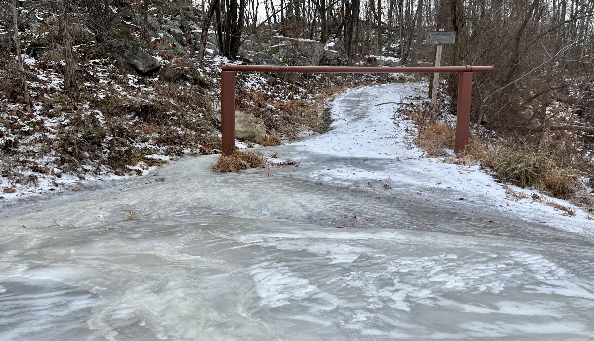 The event’s start was hardly encouraging. The race took off late, at 7:36AM. One car couldn’t make it up the icy ramp to the Camp Roosevelt Sheet-O’-Ice parking lot, forcing 10 cars behind to slowly back down the entrance drive to the horse lot, and further down the Camp Roosevelt Road. Once the 24 brave runners finally made it to the starting line, they learned that the road sections of the course had turned into ice rinks and would not be marked. Four runners dropped in the first few miles. Everyone who brought spikes used them. Those who did not quickly learned to ice skate.