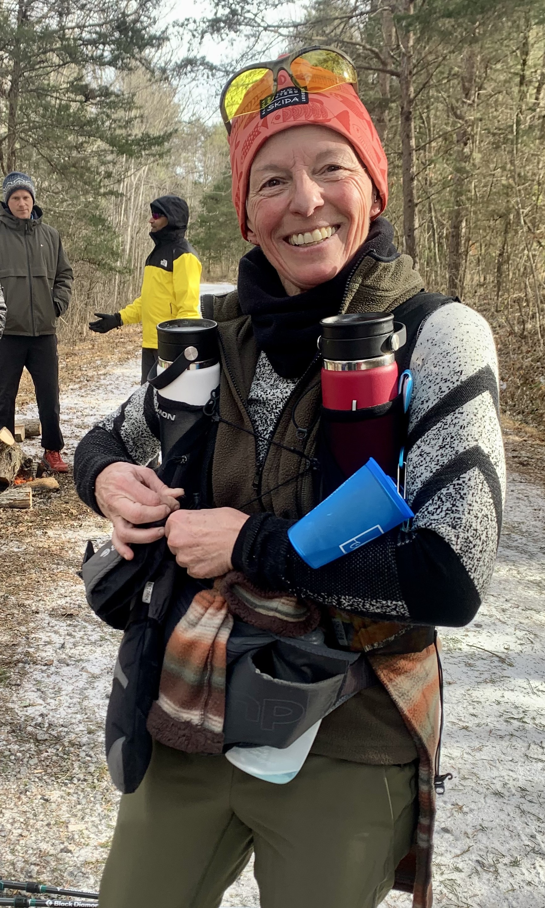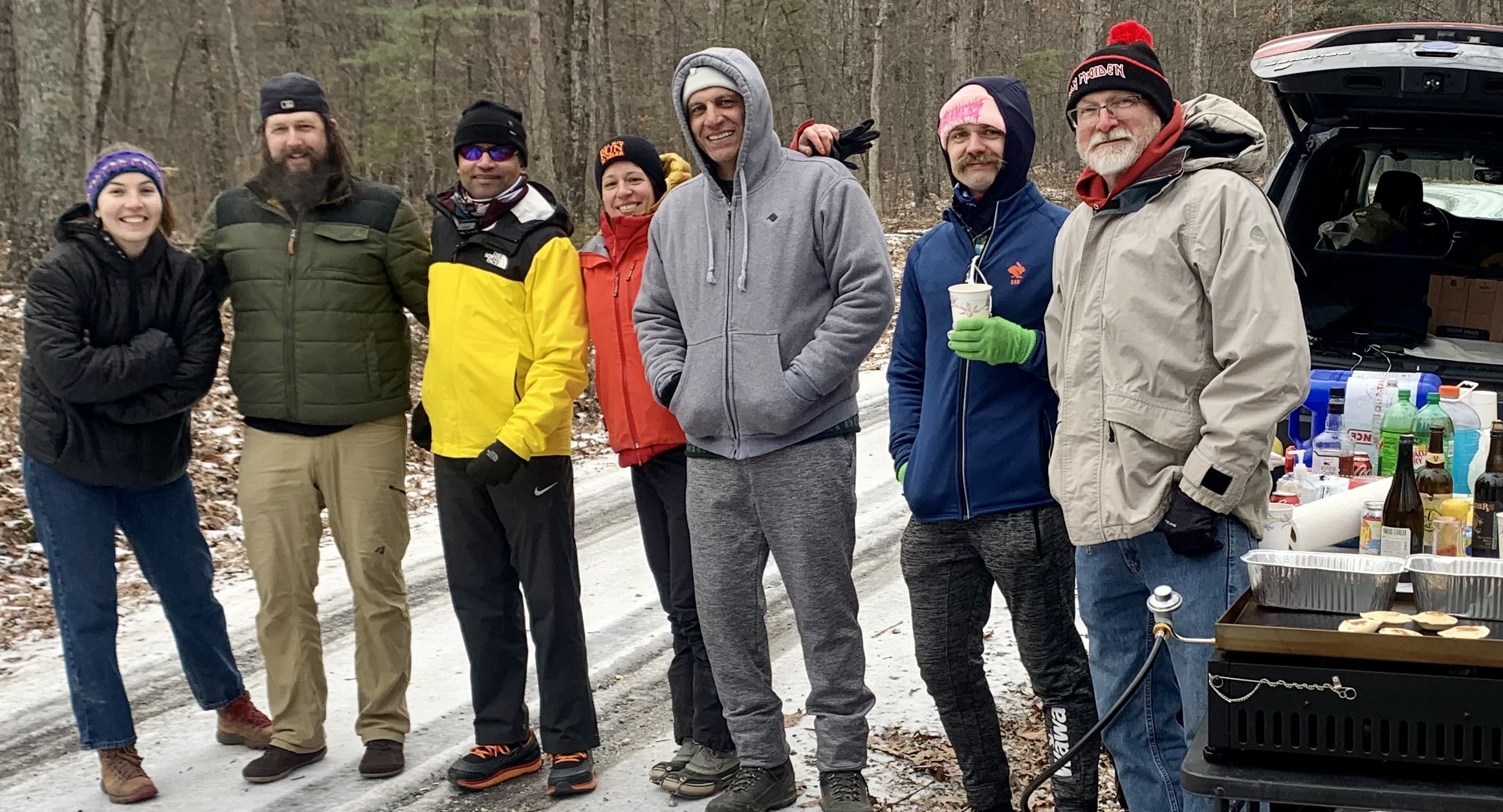 Veteran Veach Gap Aid Station Captain Jon Jester arrived laughing at the Veach ice skating rink (the planned aid station spot was THAT bad) and scouted a safer spot to set up the grill (pizza bites, grilled cheese, and ramen!), turn on the music, and lay out the booze.