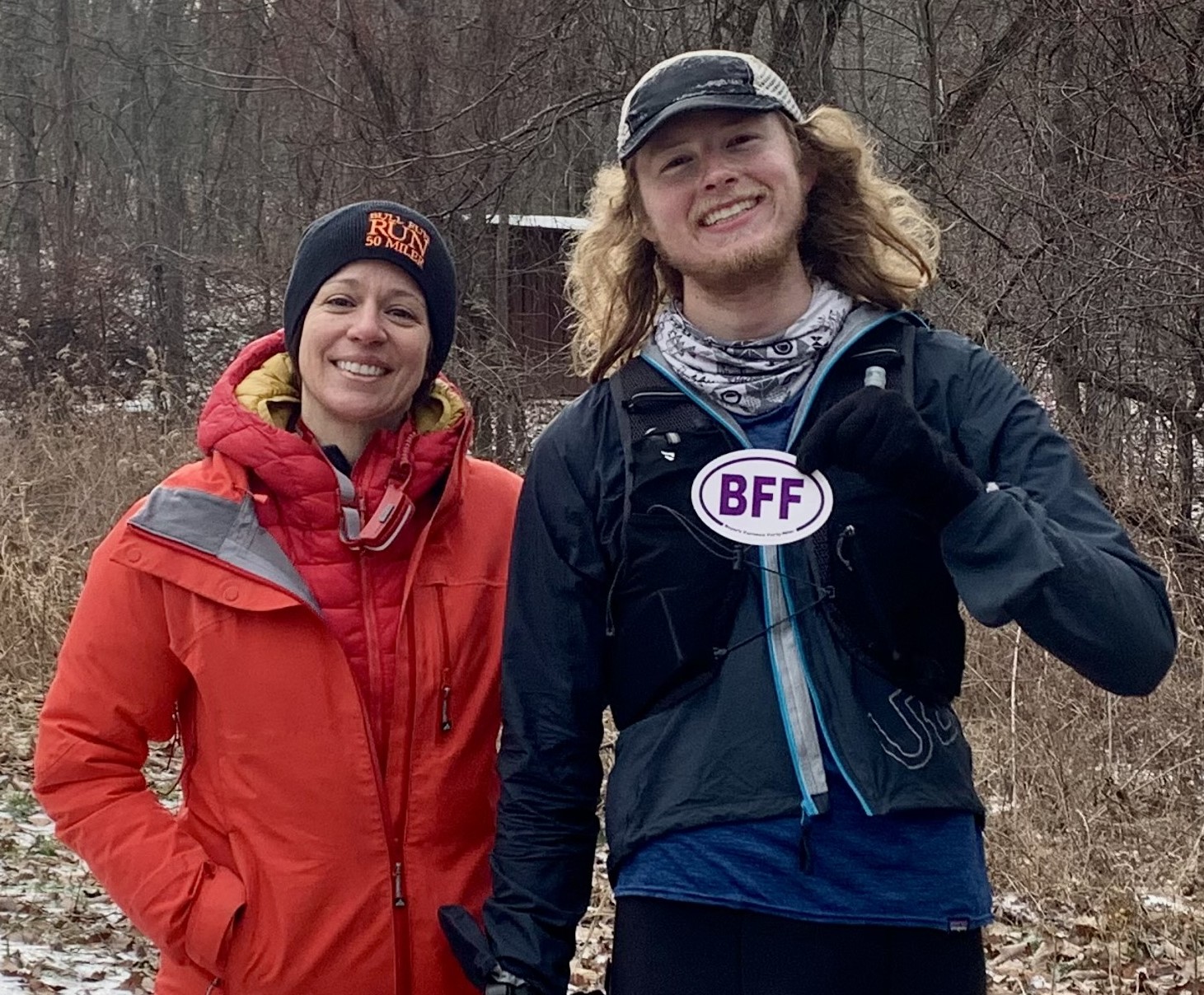 Cara Mason was our volunteer sleeper hit. She showed up with a warming hut, introduced us to propane blow torches (SOO many uses), started fires, and provided rides. Emily Fowler and Ruth Behling showed up to support their racing loved ones, and ended up working multiple stations. Nick Drozdiak was our sweeper; he needed to be swept at Edinburg. Dan Aghdam wanted to make sure the runners were safe without a sweeper, so drove and slid the last 9 icy miles of the course and barely avoided ditching his vehicle. We held Nick until the last runner came in safely, and then released him from sweeper jail. Andy and Levi provided the awesome support mentioned above.