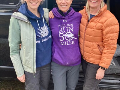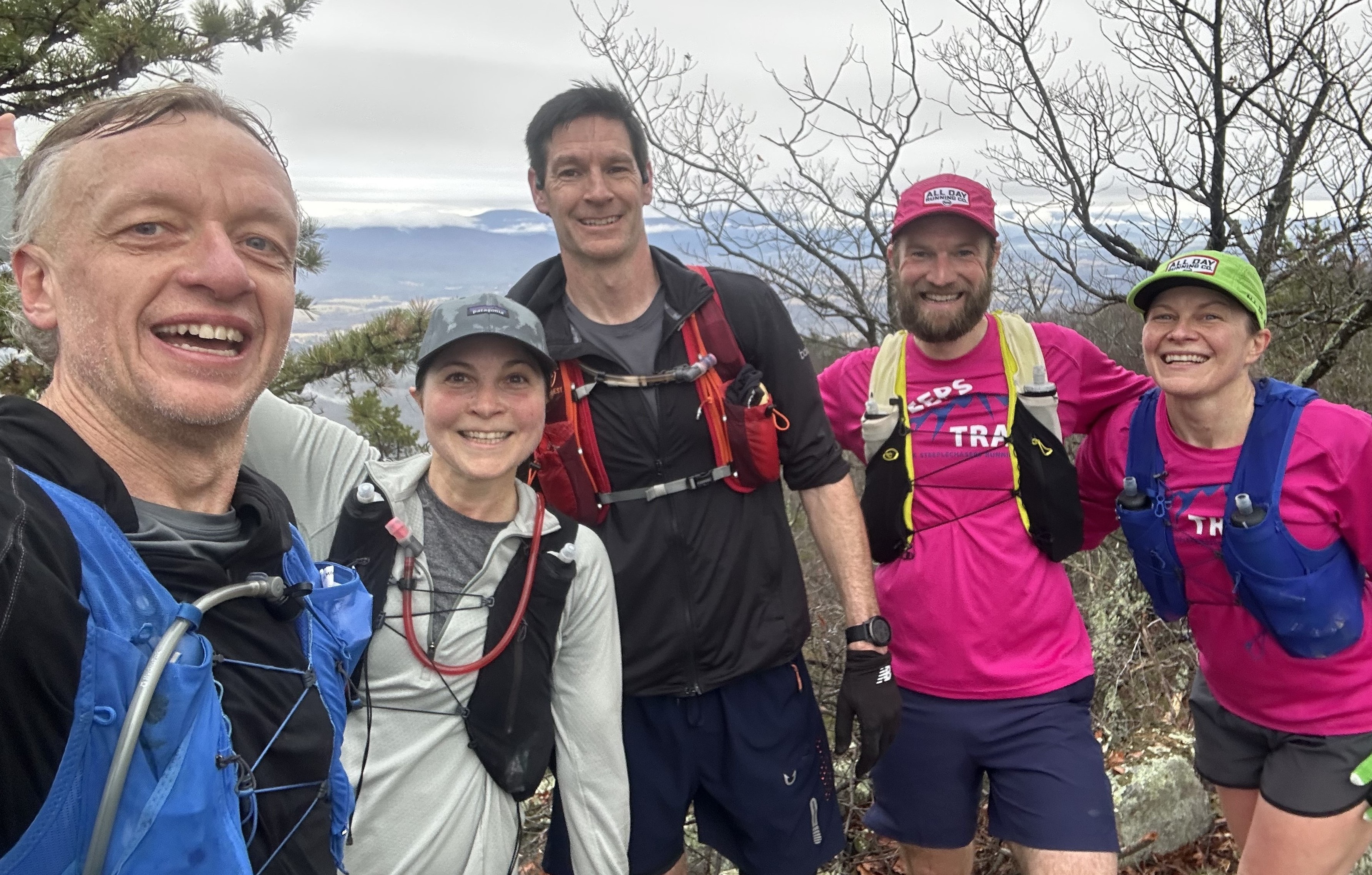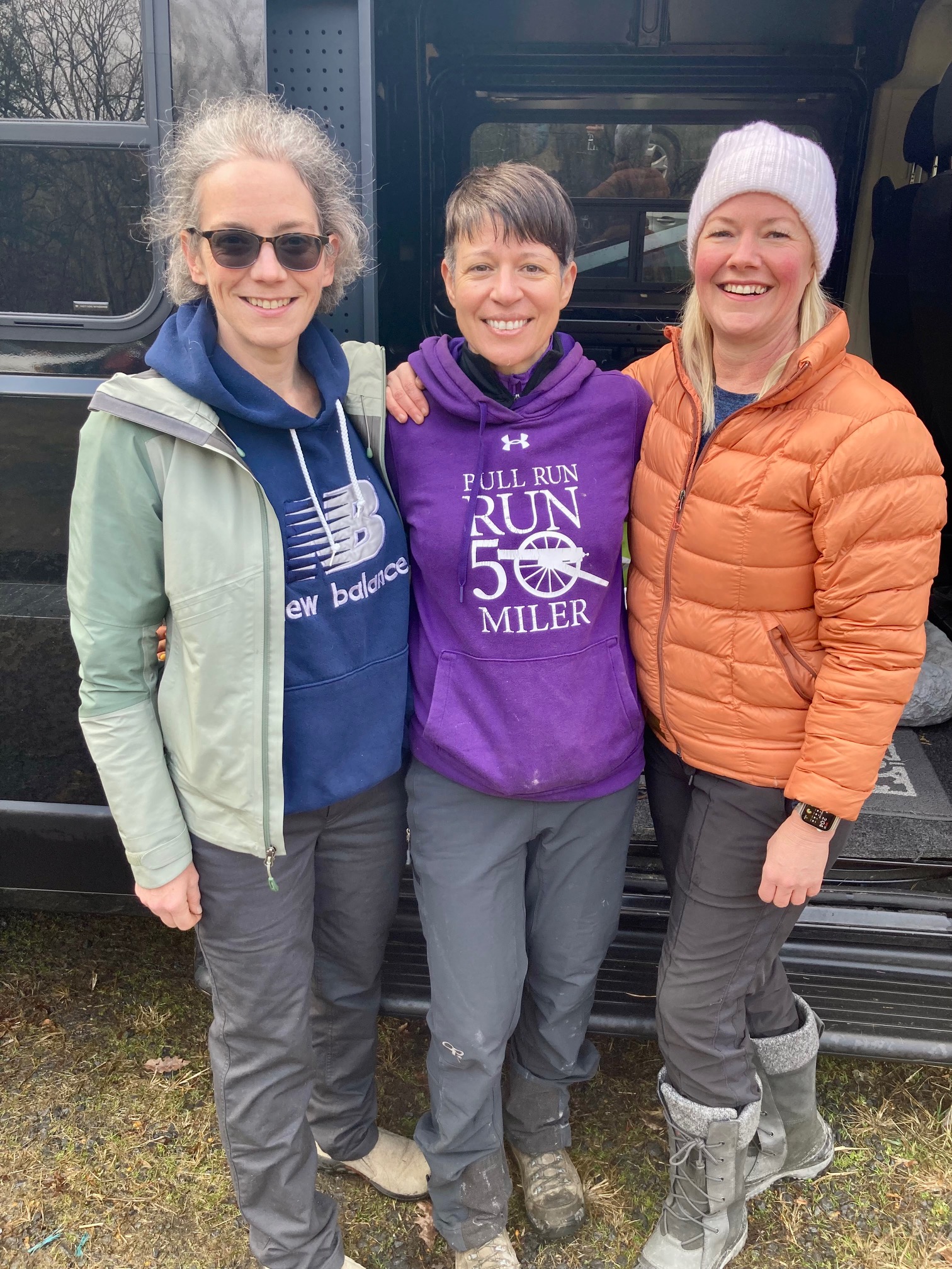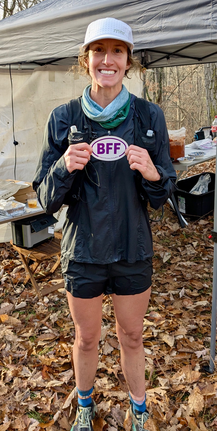 What an amazing day for an all-day party! We enjoyed starting line temps in the mid-40s, highs in the mid-50s, a bit of rain, and little more fog before the sunshine came out it in all its glory. BOTH the men’s and women’s course records were set, and there were loads of other blazing-fast times. We had at least a couple people (including Austin Williams and David McLaughlin) running their first ultra ever…woohoo! Others, including Jessie Wingo (see below), were attending their first VHTRC event ever.