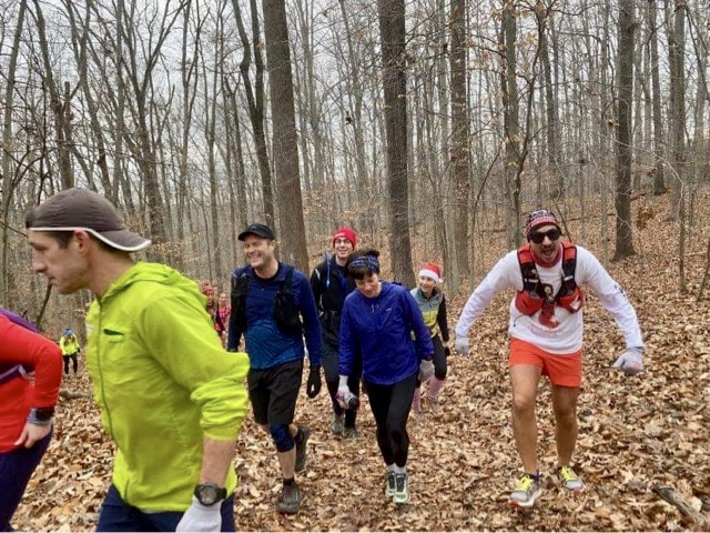 Carol appeared to know where she was going and as we got to chatting her and I took off ahead. During our charge to the Do Loop we picked up several other people to run and have fun with. We found the old blue car, VHTRC carved into a downed log, and finally Q and the surprise that was promised hanging in the tree! Q’s spandex Santa top and booty long hat were priceless. That was a treat all in itself, but the tree boasted not one, but two bottles of booze, lol. Eggnog booze! Some of our crew got down on a little holiday cheer, and some of us dug around looking for candy…. Everyone left happy.