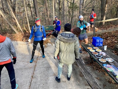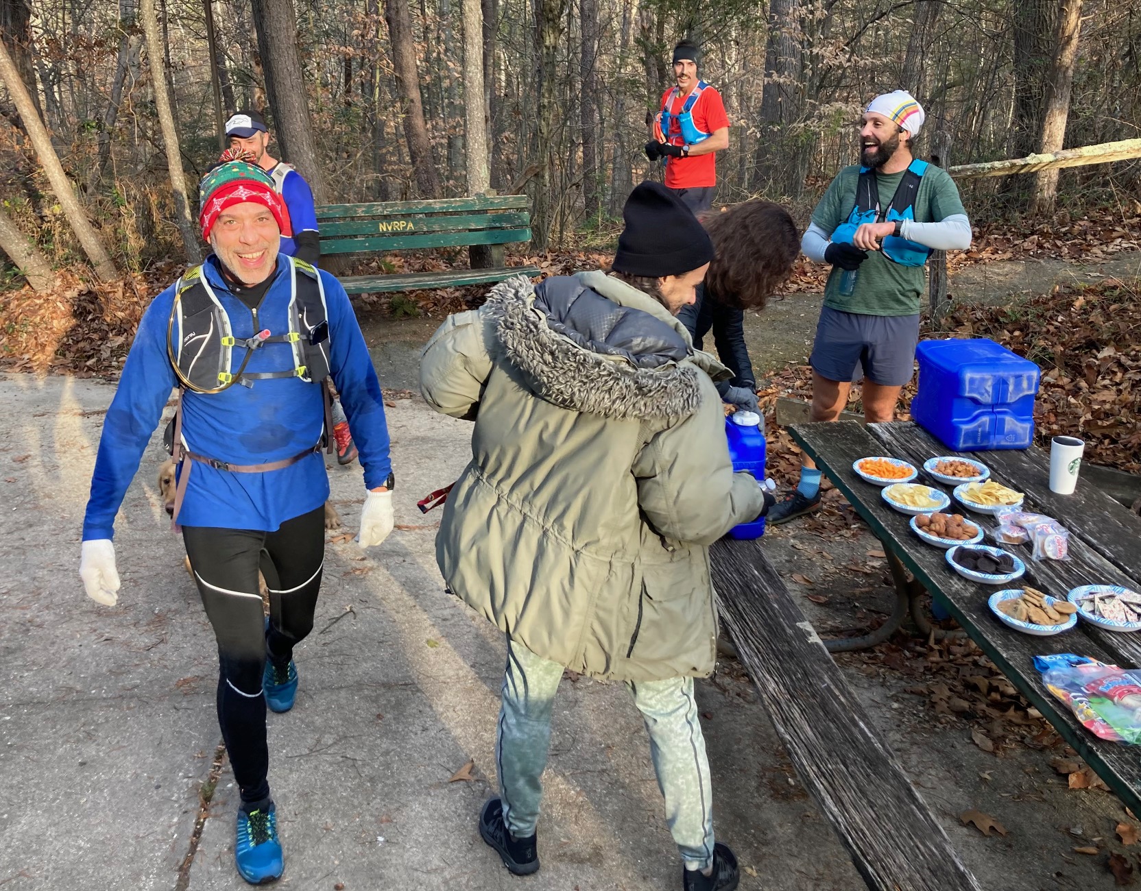 After brief remarks and the obligatory starting photo, Q officially started the race with a gentle, “go.” The chilly air warmed quickly with the warm sun, and the day could not have been better!! Whether the runners did 12 miles, 23 miles, portions thereof, or the full 50k loop (a strong group of 56!!), runners were treated to great trails and awesome aid stations (thanks Zach Weinberger and crew at Marina and Eric Levy at Fountainhead). You would think these were fully manned aid stations for a 100 miler!!!!