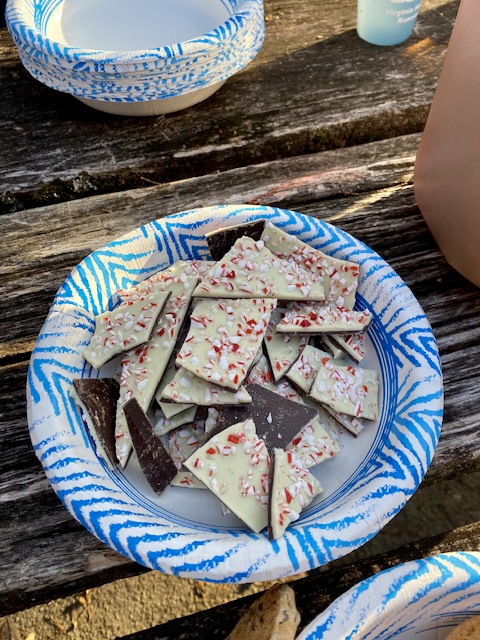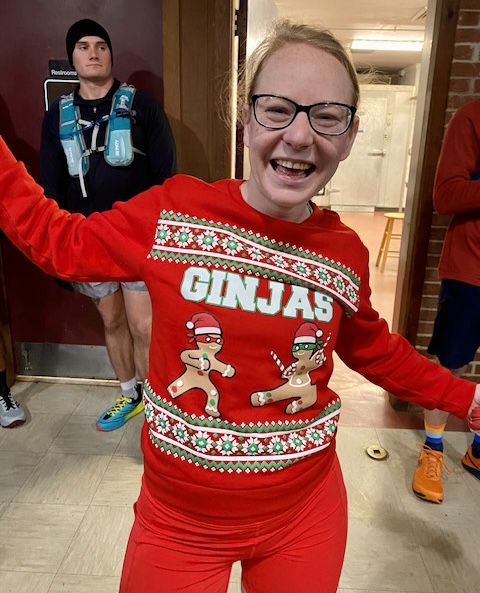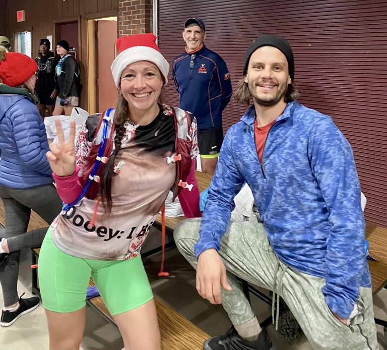 I ate some delicious peppermint bark and churro donut bites, which were incredible! Zach Weinberger was there to push his delicious aid station hits on the masses of happy holiday runners who totaled near 100 strong.