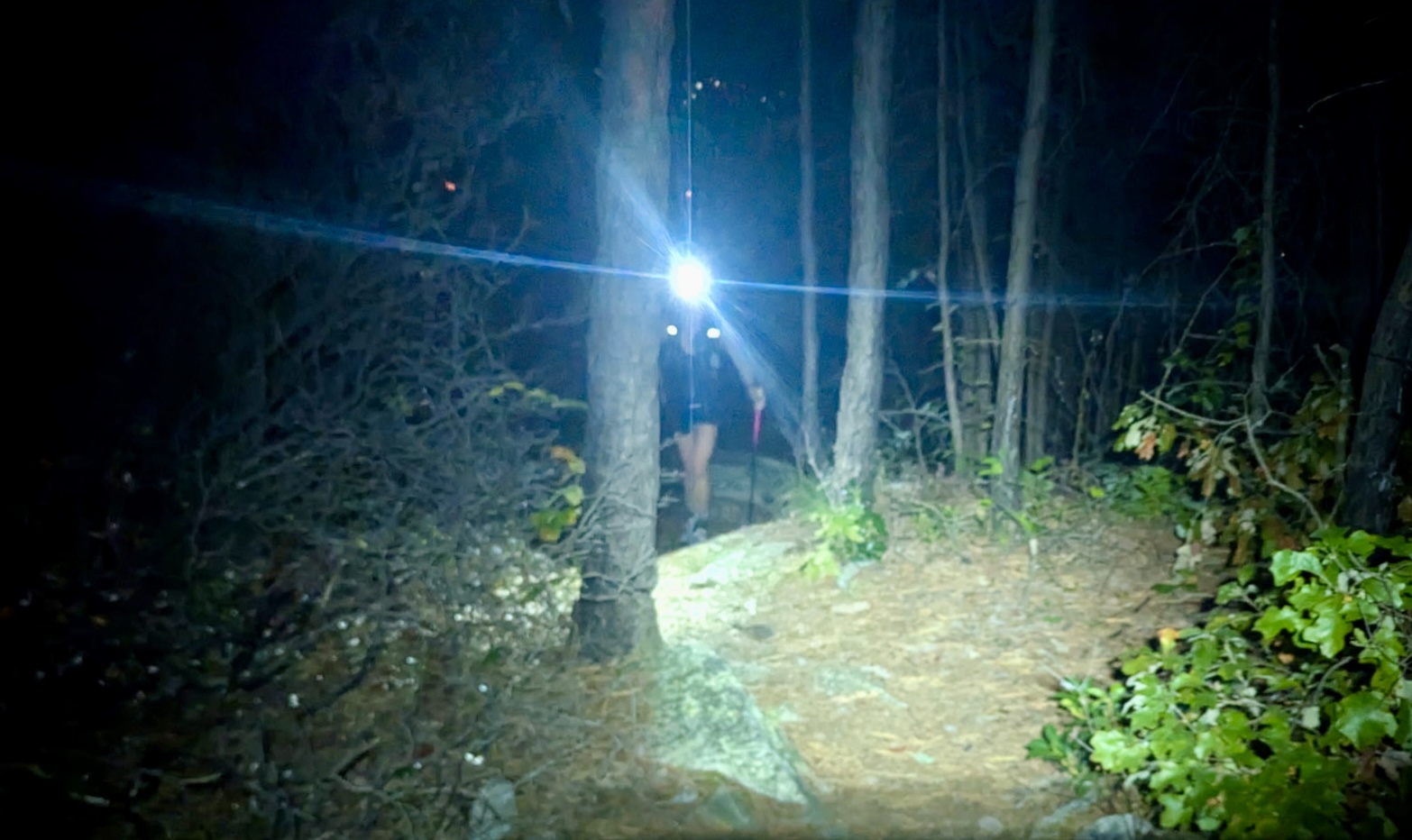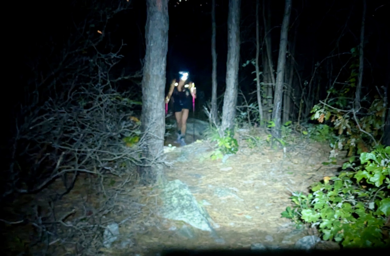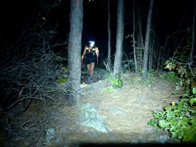 Both runners looked comfortable and strong throughout the daylight sections over roughly the first third of the course, as they made their way north from Camp Roosevelt at the southern end of the Fort Valley to Buzzards Rock, and then back into the valley at Elizabeth’s Furnace. Then things got more serious, as a couple of climbs on the blue-blazed Tuscarora Trail took them over from the east ridge of the Massanuttens to the western ridge. And to the notorious Three Top Mountain section of the course.
