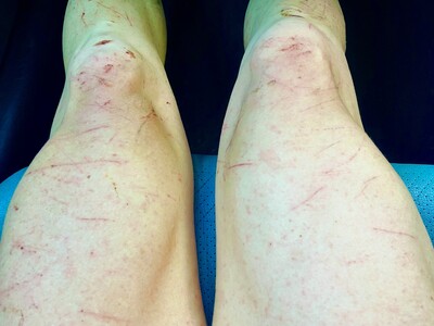 Jana survived her Three Top experience and arrived at Woodstock Tower about 3 hours after Dan. But she was still in the game and eager to press on. A photo of her eating at the Edinburg Aid Station a few miles later shows the effect of that Three Top section, as her legs looked like they had just been through the Rat Jaw powerline climb at the Barkley Marathons (see that photo in the gallery below this report; Jana supplied a more detailed image that can be seen to the left).