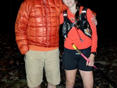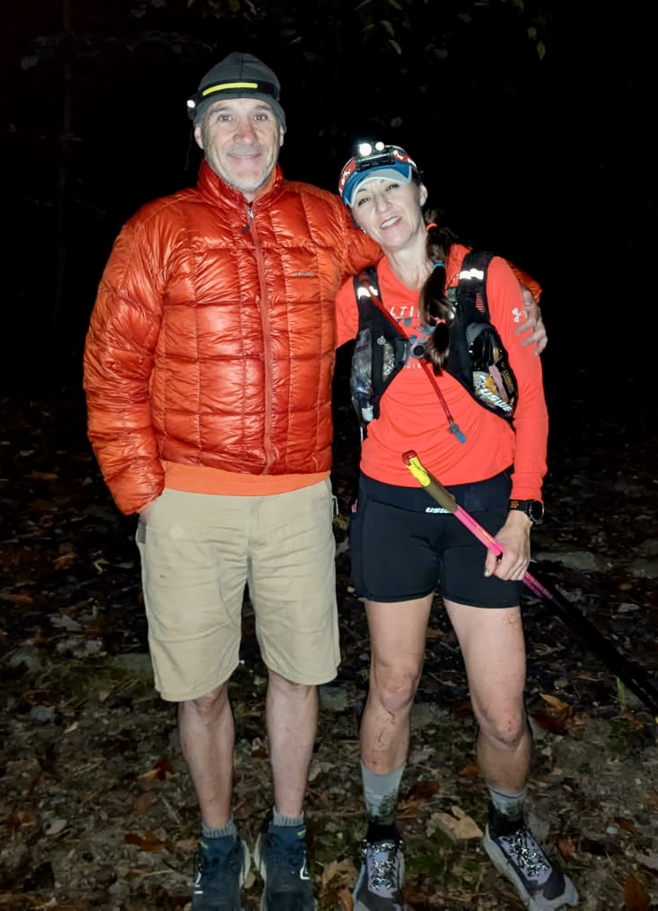 She also benefitted greatly from some expert and timely assistance from last minute Safety Runner volunteer, Carl Bligan. Carl picked Jana up at her second visit to the Picnic Area aid station, nearly 35 hours into her run (and just shy of 9 PM, so early in her second night). The two of them stayed together over the final 16+ miles of the course, which involved a second climb up Waterfall, a delightful journey across Kerns Mountain, a plunge down Jawbone to the final aid at Gap Creek II, then up to Peach Orchard and down to Duncan Hollow for the final muddy miles to the finish at the pavilion at Camp Roosevelt. Jana and Carl were joined at Gap II by the event record holder, Luc Claessens, who provide a boost to them both over the closing 6+ miles to the finish.