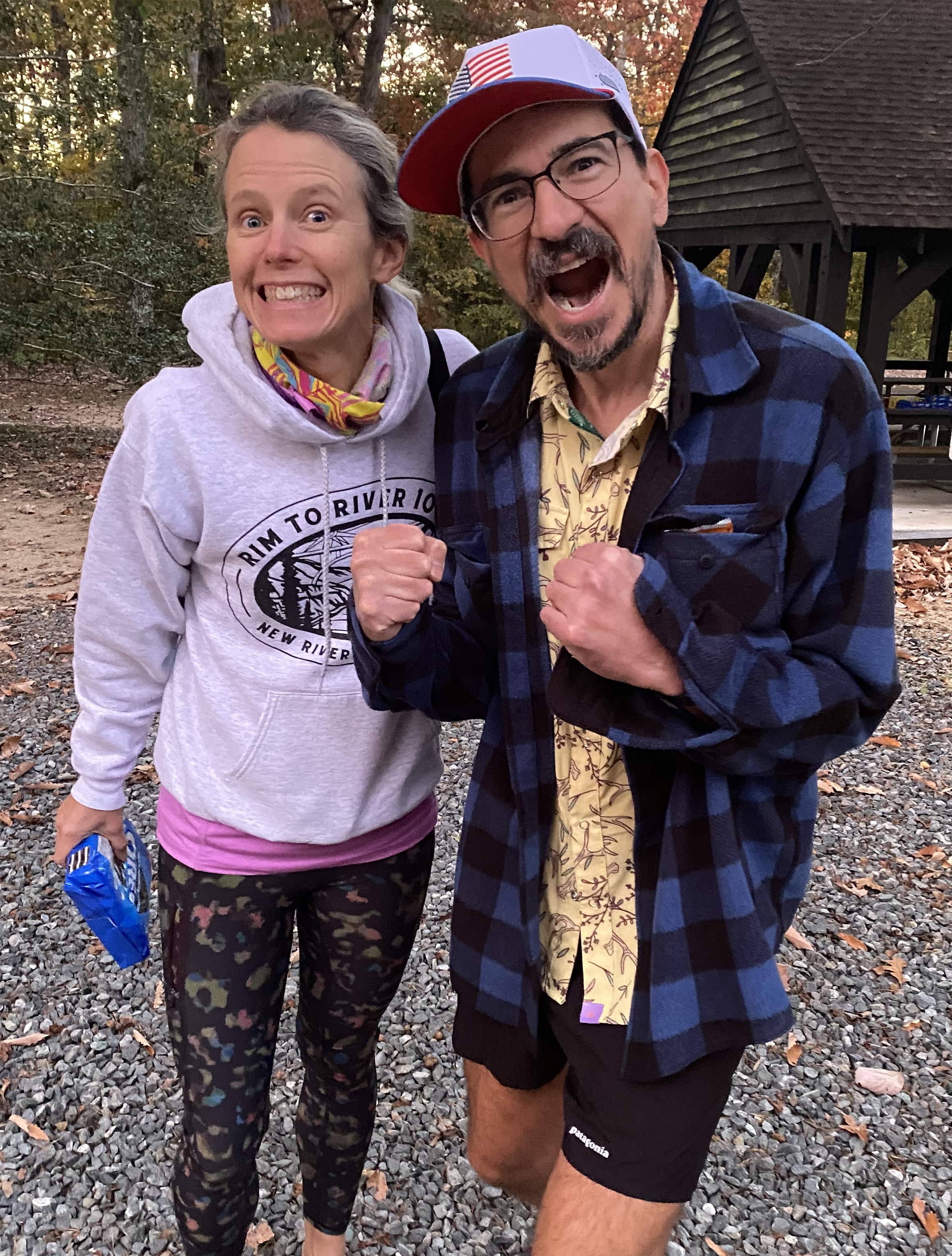 So this was kind of a bizarre aid station encounter, but entertaining. When I got there, a man came in behind me, and a friend of mine, Jennifer, who was volunteering at the aid station, said, “This is my brother.” I was like, cool. I was moving slow but on the timeline I wanted to finish now, so I thought he would just pass me when we left.