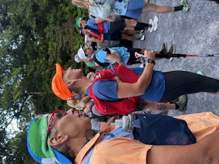 I started out the race so happy, having connected with so many happy, smiling friends, and a loud send off by Bob telling us to “Get the Hell out of here!”, gotta love Bob! Off we went to the beautifully trimmed trails-many thanks to our volunteers for all of your efforts, as I know it was a LOT of work-up the hill we all went. It didn’t take long to settle into a nice easy pace chugging uphill, chatting as we went. By the time I hit the first downhill section, I was super happy to be cruising a bit, perhaps too happy, and was reminded that you cannot take your eyes of the trails for a second out there, down I went. I jammed up my thumb, hit my hip and knee on the way. I got back up, assessed the damages, and brushed myself off. My right thumb was definitely not happy, already swelling and not feeling great carrying my pole. A few more miles in, I had relaxed a bit more and set into what I thought was a reasonable pace. I made it through Milford, where Larry Tumblin helped me fill my pack, making it much easier to deal with the thumb not working well.
