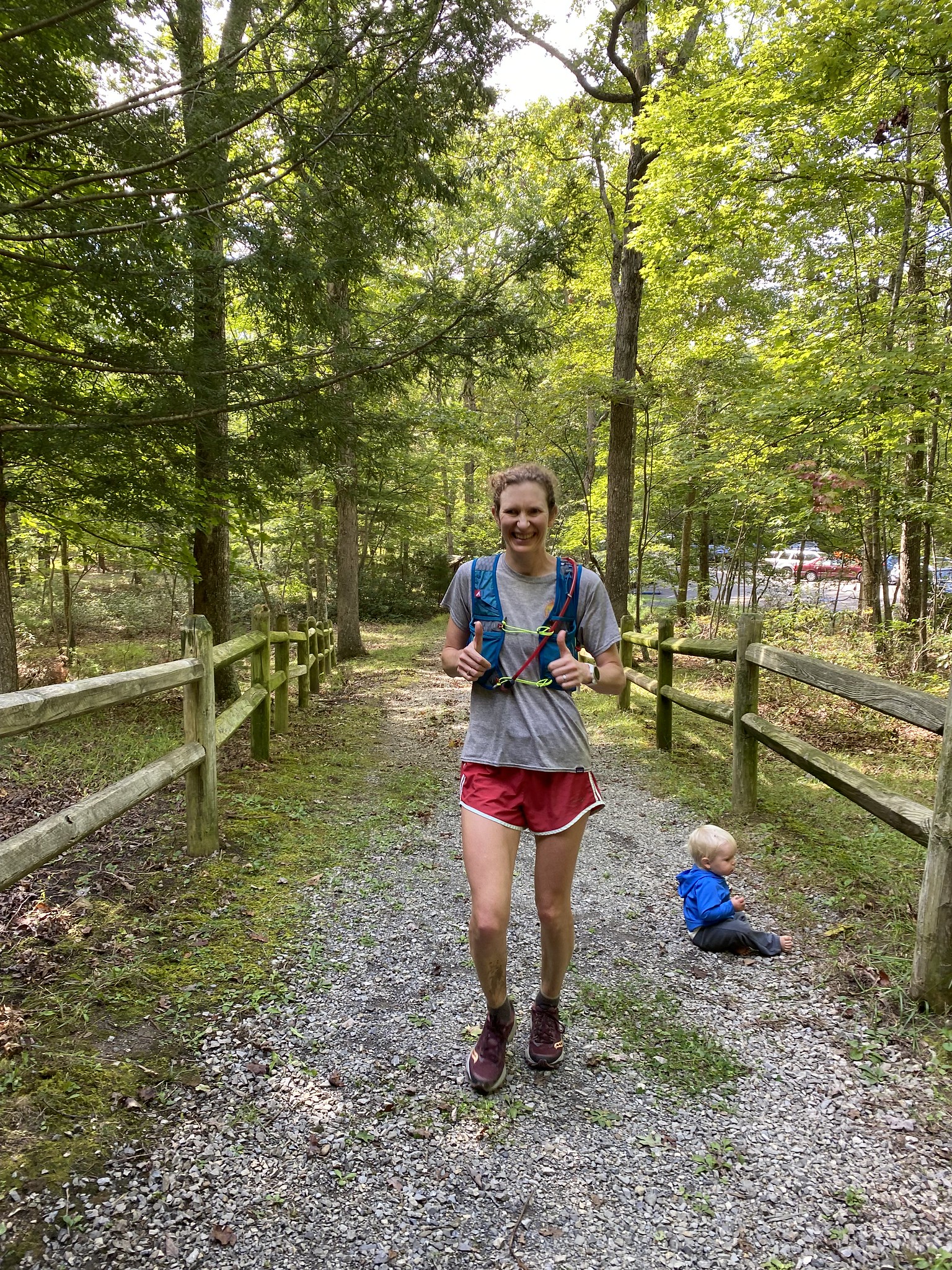 Thanks to the beautiful race day weather, as well as the opportunity to again socialize after a year of near-isolation, many of the runners and volunteers stuck around for the cookout at the finish line picnic pavilion, as well as camping at Trout Pond. Thank you to Dan Aghdam and Wendy Valdes for manning the grill and food table! Dan’s Meats cannot be beat! Thank you also to Quatro Hubbard for the general support and help with procuring supplies. We are extremely grateful to the wonderful course markers, aid station volunteers, and sweepers as well as the runners for taking a chance on brand new race directors (toting a toddler around the course, no less!). This would not have gone so smoothly without the copious notes, advice and documents handed down from previous race director Kirstin Corris. And last, but by no means least, a huge thank you to the support of the Virginia Happy Trails Running Club for the backing that allows this race to take place, and to MMT 100 race director Kevin Sayers in particular for allowing us to borrow MMT gear for the aid stations at the Big Schloss.