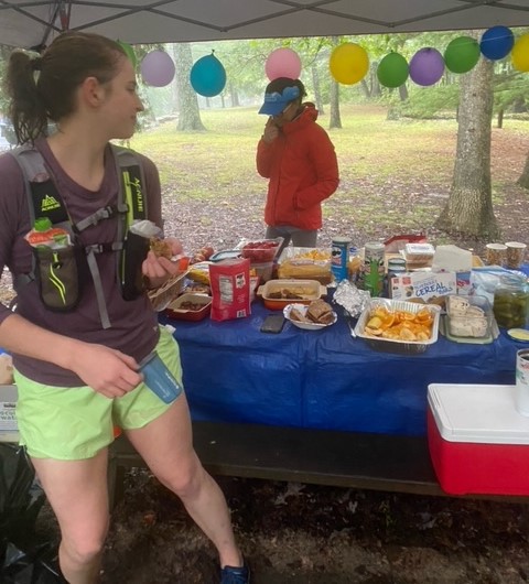 Wow. I thought that the 1st aid station was good. Josh Howe was out there being all gourmet chef and serving multiple types of delicious soup and grilled cheese with Gruyère! I got a cup of soup and dipped the grilled cheese in it. So amazing. Because of my lack of hydration, I also drank an entire container of coconut water. I ate a bunch more snacks, then headed out.