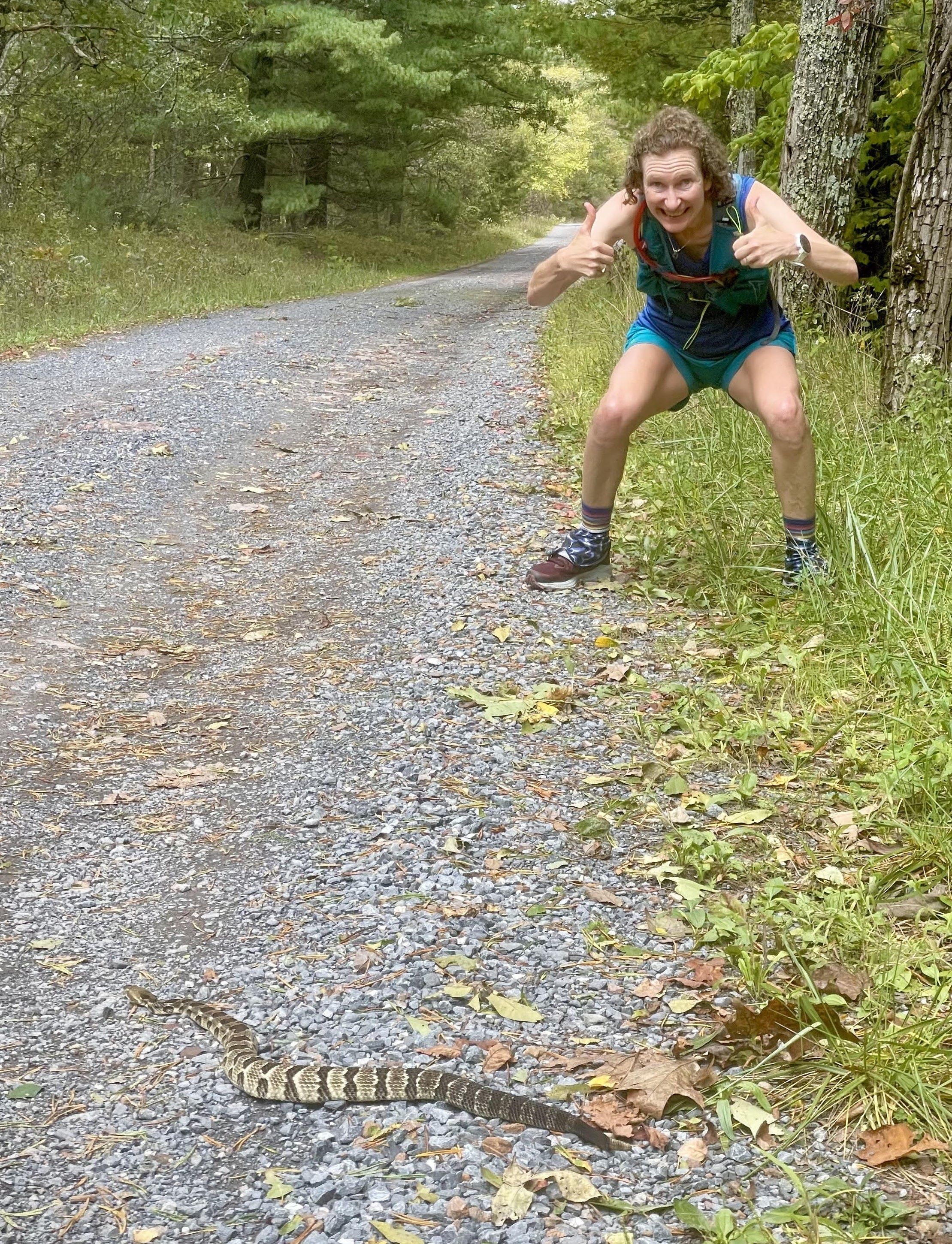 The mood was upbeat and slightly mischievous at the finish, as Dan Aghdam once again served his delicious meats while Chelsea Smith’s kids recruited Theo into attempts to frighten the poor finishers with a very realistic-looking snake. Consensus of the runners seemed to be that, despite the amazing wetness, these trails were wonderful, the views were spectacular, the volunteers incredible, the aid stations were better than many paid events, and Tibbet Knob and the road climb were sneaky hard. Also, maybe it would be more fun to volunteer next year!