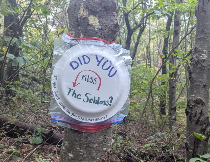 The climb up the Big Schloss Cutoff Trail and over Mill Mountain to the view was a completely different experience from the previous year, with runners noting hot, sun-exposed trails and humidity as opposed to chilling wet winds in 2023. Luckily runners and sweeps paid attention to the weather report and left their gloves and hand warmers behind. The reward for their efforts was a beautifully clear view from the Schloss, for those that made the trip. This year veteran Big Schloss runners Quatro Hubbard and Dani Sevel joined the exclusive club of finishers that missed the Big Schloss view. Quatro was apparently distracted by some engaging conversation on the trail, and Dani presumably decided that she had met her weekly mileage goals, having finished IMTUF 100 miler less than a week prior. Another member of this club, Ram Oruganti, elected not to renew his membership this year and made the full Schloss.