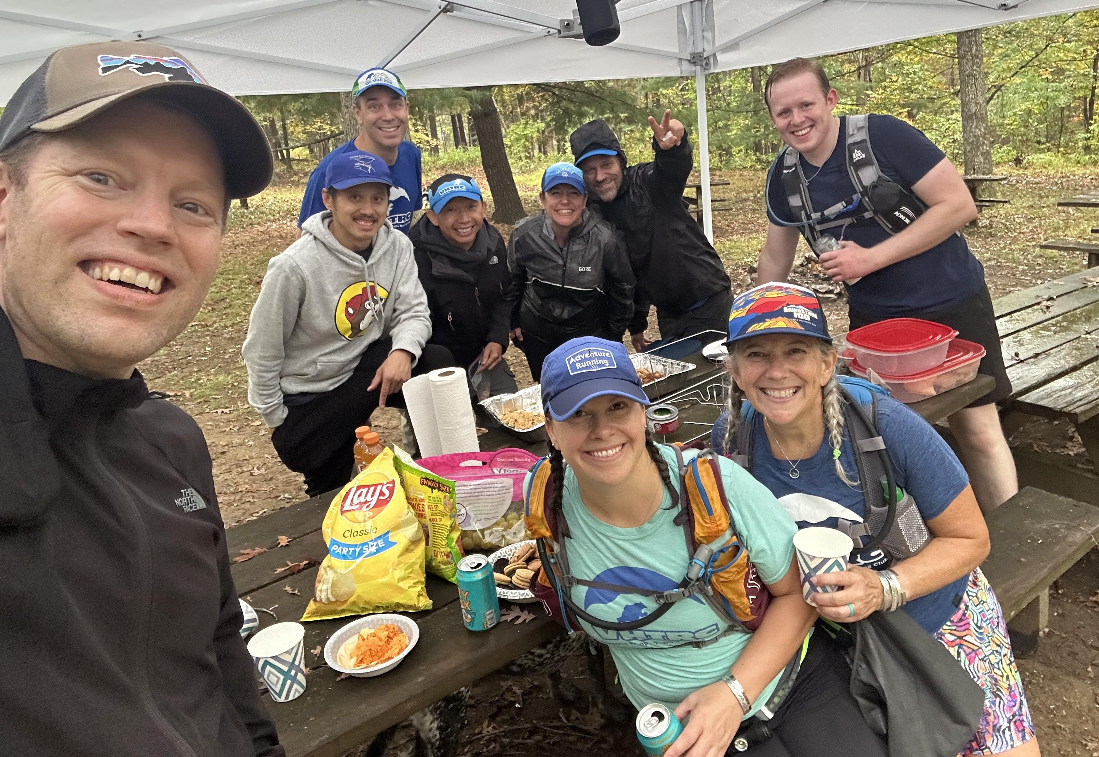 Last year’s winner David Yoder started out in the lead into Bucktail Aid Station, with another Harrisonburg area runner relatively new to Virginia and running his first VHTRC event, Lance Harden, close behind running with John Oplinger. Katie Thompson, running her second Schloss, took the lead early for the women, followed by newcomer Mary Donahue. Runners were greeted by Ivory Lira and her team, with a birthday theme in honor of volunteer Lexi DeLisle. Little Stony Creek Aid Station, organized by Quatro Hubbard, saw Lance come down the trail in front and John right on his heels, with Bradley Hawley not far behind. Despite being within reach of the lead, John was enticed by Quatro into an impressively large swig of Jim Beam, which he may or may not have regretted later in the run. Unfortunately, David Yoder limped into Aid 2 next with a turned ankle and had to call it a day but was happy to lend a hand to help runners and volunteers at Aid 3 and the finish which was very much appreciated! The ladies held steady with Katie in the lead, Mary looking fresh in second, and Lindsey Weaver starting to separate herself from the rest of the women by Aid 2. The rain became steadier by Aid 3 at Wolf Gap, led by Jesse Fuller who cooked up some expertly seasoned fried rice, and The Big Schloss could be seen draped in clouds. Luckily most runners reported that the views were still dramatic from the top and not socked-in for the most part. The climb out of Wolf Gap up to Tibbet Knob caught some runners off guard as Aid 3 volunteers have been known to advertise that the course was “all downhill from here.” Caroline Prendergast was among the runners surprised by the steep ascent and rock scramble, remarking at the finish, “Who put a little bit of Old Rag in at the end there??”