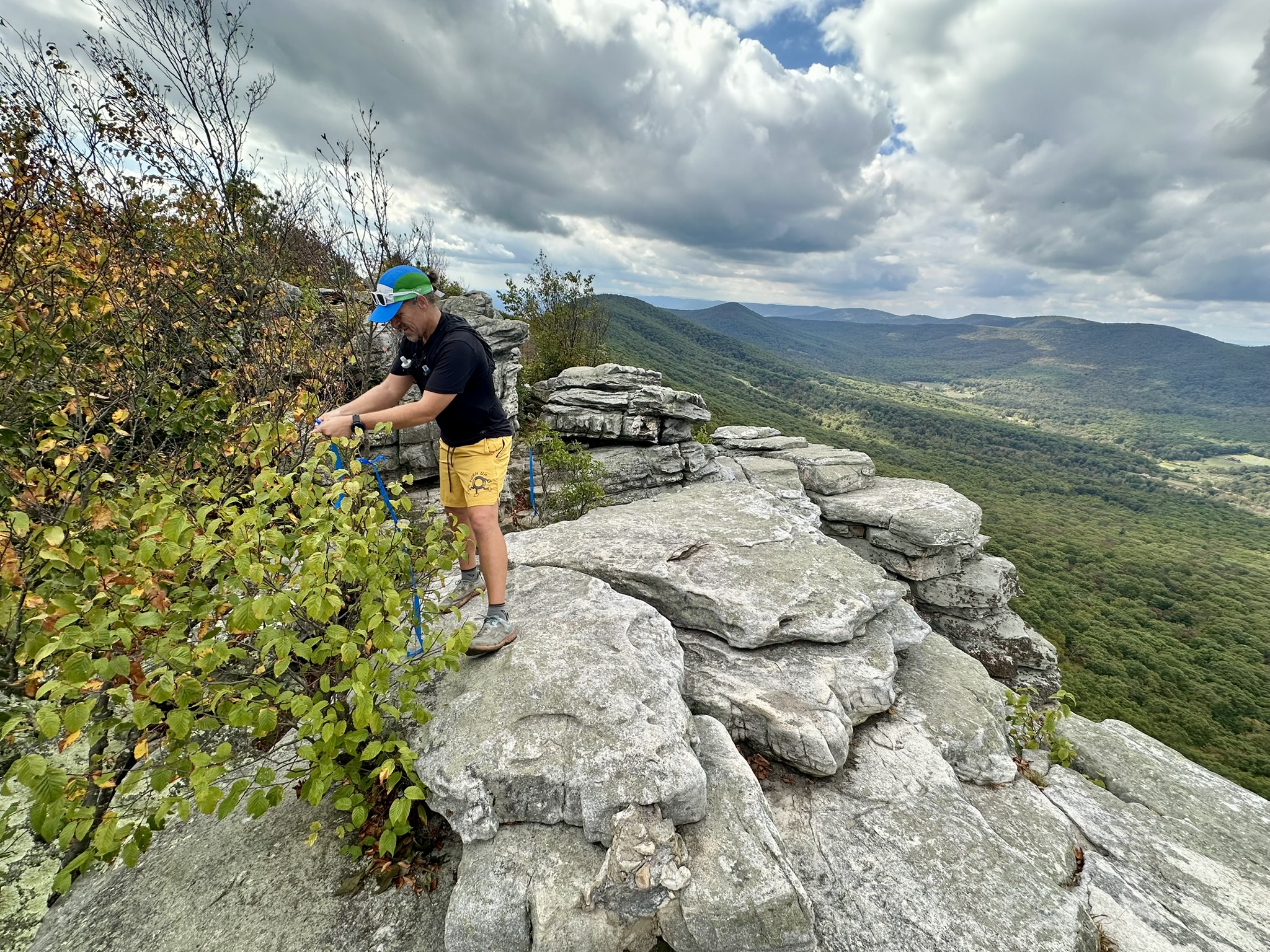 The crisp feeling of Fall has been in the air on Great North Mountain for the last couple weeks, with recent dry weather bringing changing leaves earlier than usual. Unfortunately, as has been the case for the past 2 years, the rains returned for the week of the Schloss, with a forecast of showers for the day of the run. Thankfully we did not experience the deluge that we had last year or the hurricane the year before that, with only passing sprinkles and mists keeping the day cool though still somewhat humid until a steady rain developed towards evening. The Schloss trails had experienced the same massive overgrowth seen throughout the region this year, due to the heavy constant rains earlier in the summer, but again the PATC North Mountain Brigade led by Mike Allen was up to the challenge of getting the course ready in time for the run. With several trailwork days, and the help of runners Marcia Washburn, Chris Flint, and Nathaniel Faunce, in addition to myself and Bob Gaylord, the Brigade chopped, weed whacked, raked and clipped the trails into submission. With all this work, runners commented that they were some of the most groomed and runnable trails they’ve seen all year. Many thanks to the team for the fantastic work, we are lucky to have them!