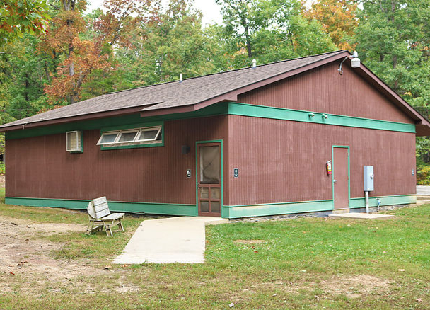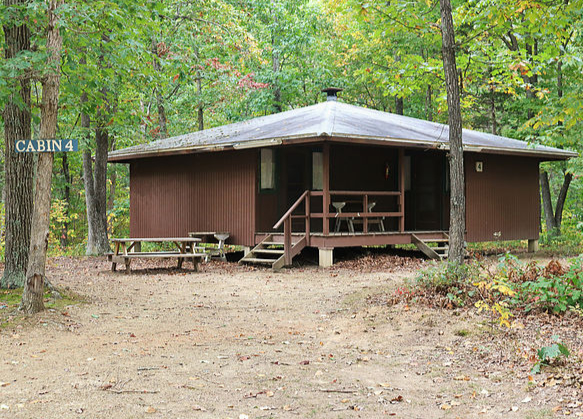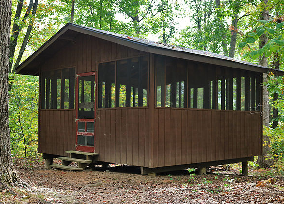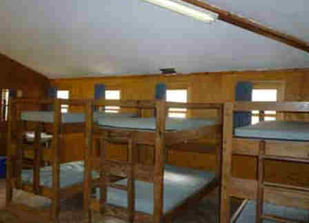 There are six cabins available. Each unit has bunk beds, sleeps 12, and has a half bath. The cabins are clustered near the bathhouse. The bathhouse has showers. You will share a cabin with others.