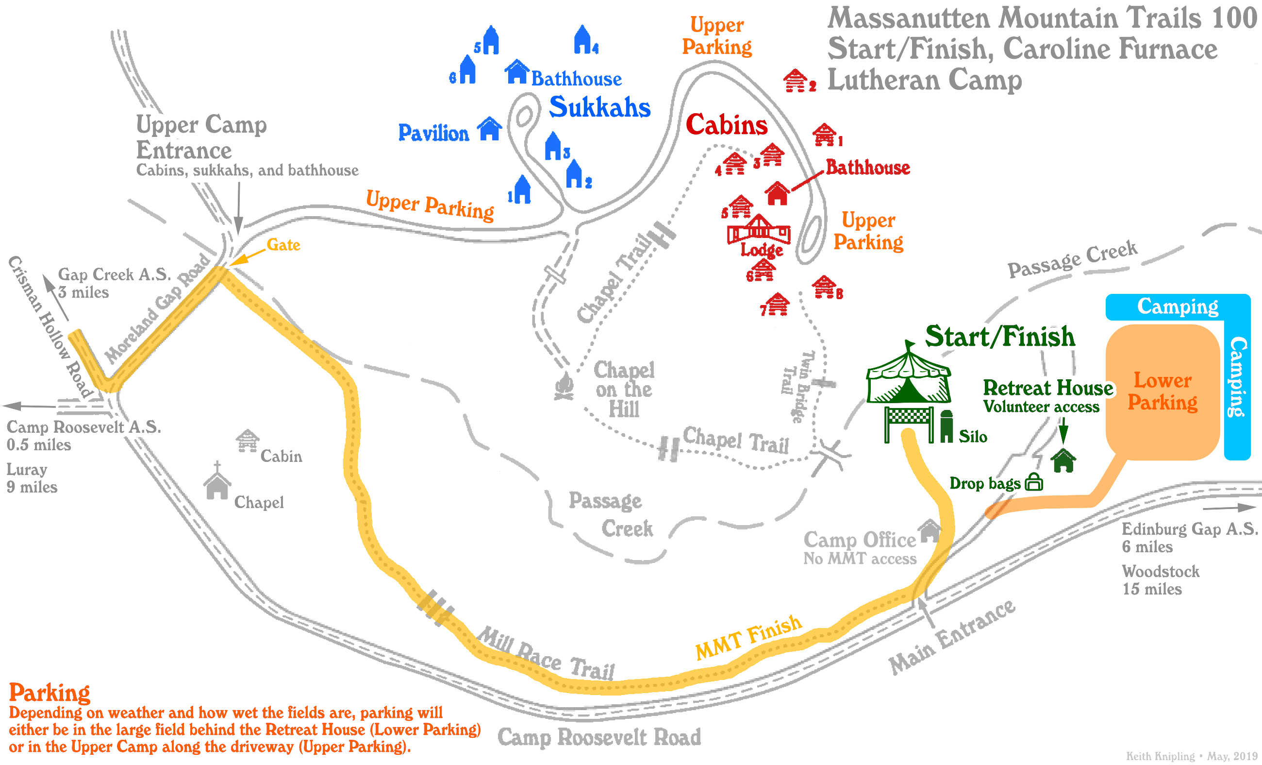 The Caroline Furnace Lutheran Camp offers great opportunities for inexpensive lodging at the start. This is rustic (think summer camp), but comfortable.