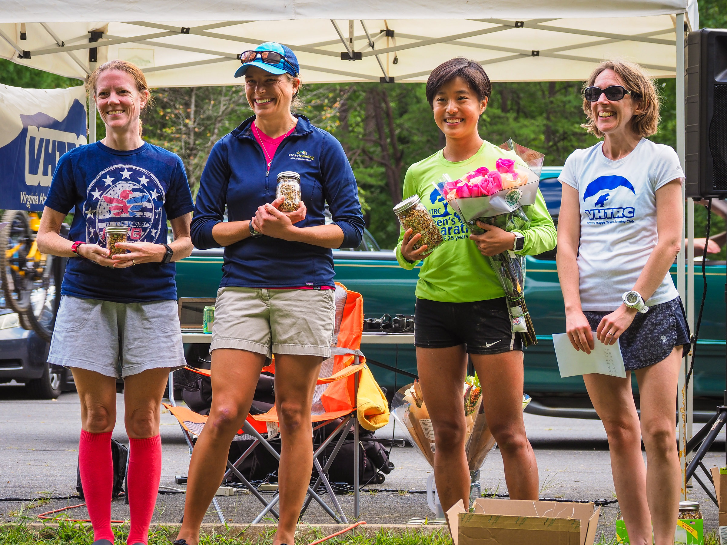 The 2017 podium, right to left: Mary Hui (1:41:01), Sarah Schubert (1:42:01), and Erin Williams (1:52:05) with race director, Tracy Dahl, on the far right.